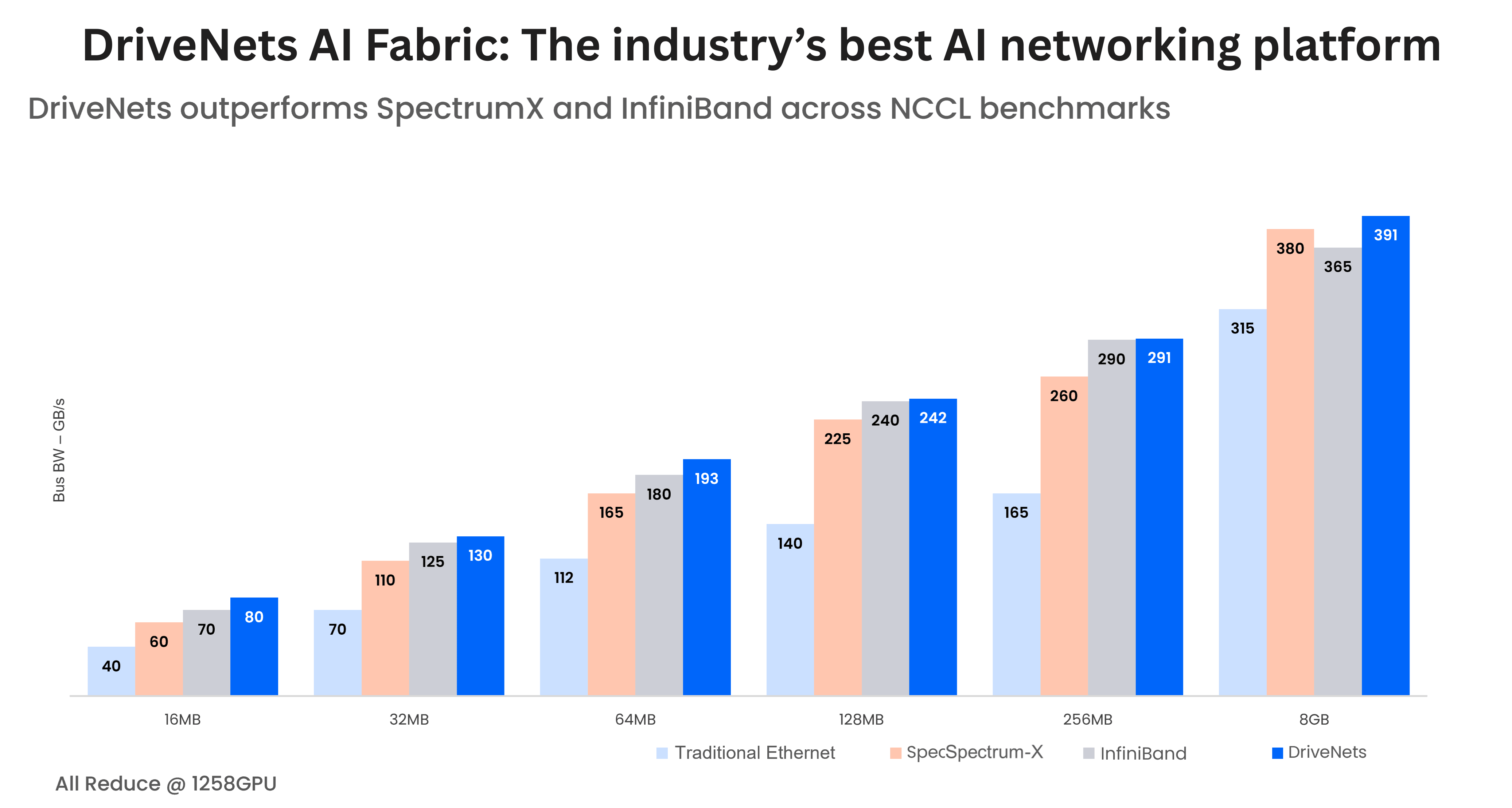 - In a real 512-GPU production cluster, DriveNets outperformed InfiniBand by up to 18% on NCCL benchmarks, proving Ethernet can exceed proprietary alternatives at scale.