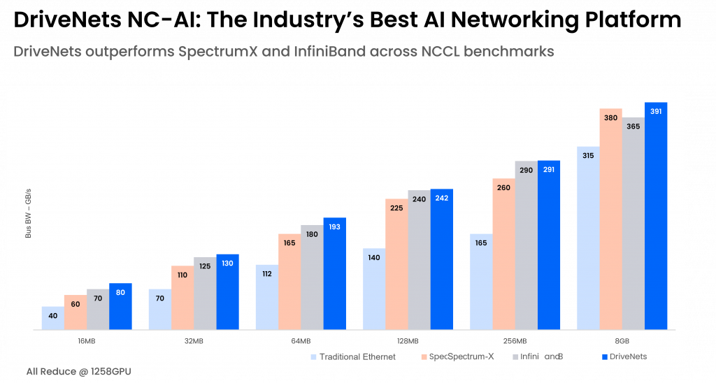 In a live 512-GPU production cluster, DriveNets’ Fabric-Scheduled Ethernet achieved up to 18% better NCCL performance than InfiniBand across tested workloads.