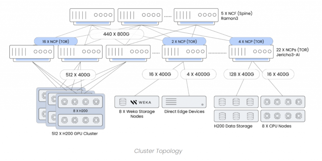 - Network: 22 NCPs (top-of-rack (ToR) switches) and 5 NCFs (fabric switches), built with Accton NCP5 and NCF2 white boxes, powered by Broadcom Jericho3AI and Ramon3 chipsets